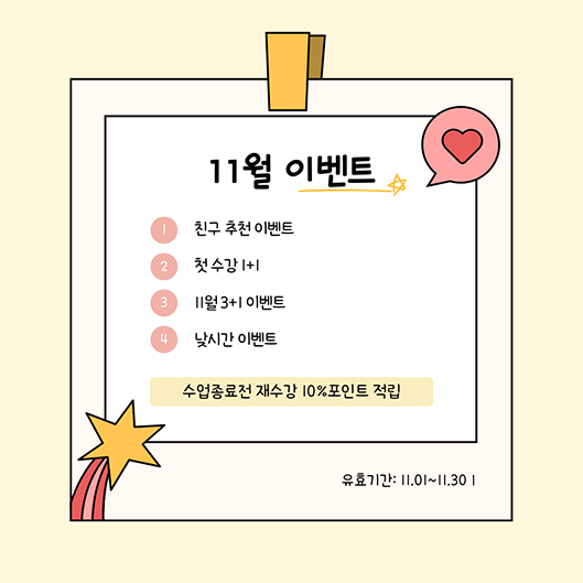 단 한번 뿐인 특별한 이벤트 첫 수강 회원님들께 드리는 1+1 이벤트 한 달 수강신청시 무료수업 1개월 추가 3+1 이벤트 주5회,3회,2회 20분/30분 3개월 수강신청시 1개월 무료 수업 추가 11월 해피타임